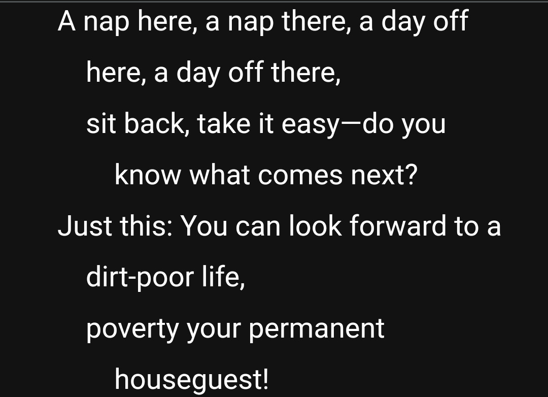 Hally's translation: If you sleep too much, sapa will catch you and refuse to leave you alone! No be me talk am o .